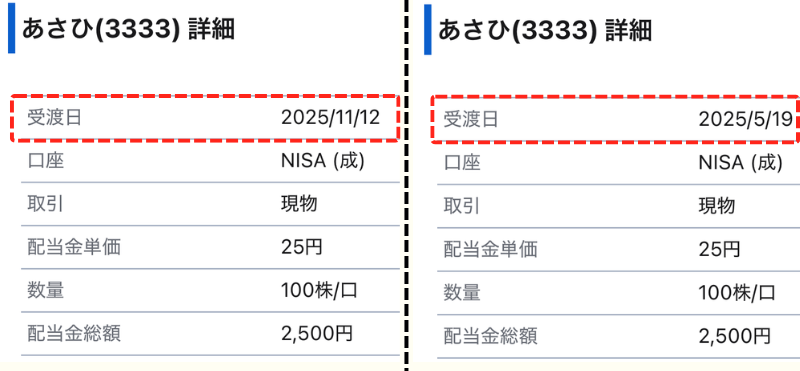 配当金を受け取るには、権利確定日の2営業日前に株を保有する必要があります。なお、2025年は5月19日と11月12日に入金されました。