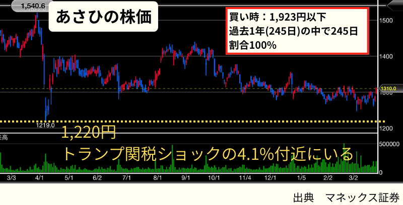 現在(2026年3月)はすでに買い時の水準を推移しています。暴落時には最大4.1%(株価1,220円)まで下落する可能性も念頭に置いておきましょう。