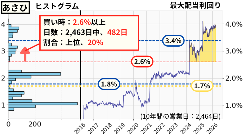 10年間で営業日は2,463日ありました。配当利回りの中央値は1.7%です。