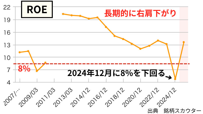 - ROEが長期的に低下傾向、訴訟などの特殊要因による減益リスクがある