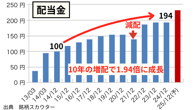 | 配当金の推移 | 連続した増配傾向 | 増配傾向 | 減配実績あり |