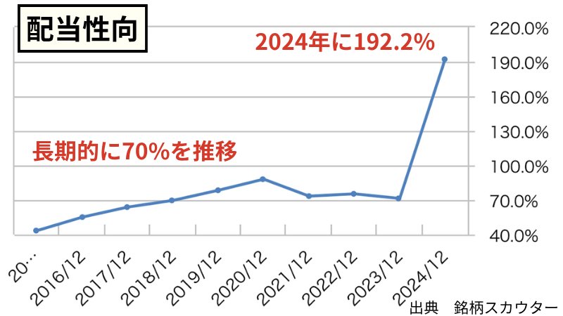 | 配当性向 | 192.2% | 長期で70%前後を推移 |