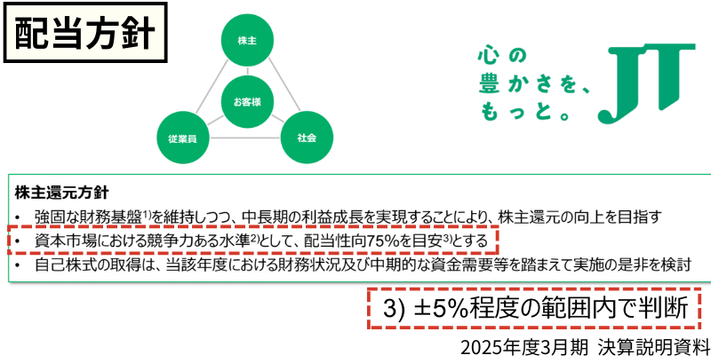 JTは配当方針として「配当性向75%±5%」を目安にしています。減配せず、154円で維持した場合の配当性向を計算します。