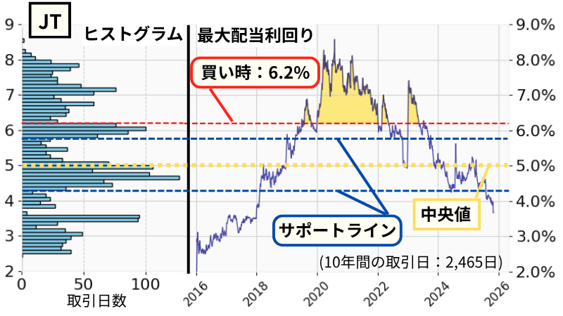ヒストグラムから取引日数が集中している利回り、最大配当利回りの山谷から、市場が意識しているサポートラインを設定します。