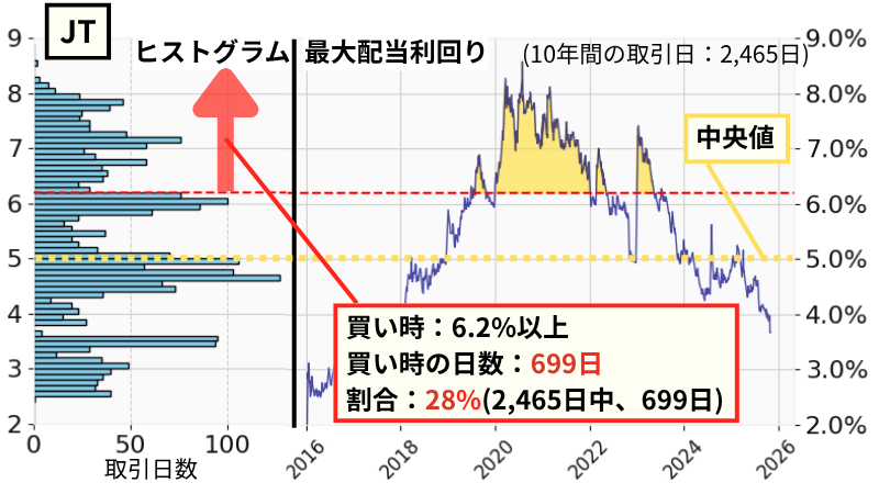 買い時は「配当利回り6.2%以上」(株価3,774円 ※2025年度配当234円の場合)です。この水準は10年間で28%の営業日しか到達しておらず、高値掴みを避けられます。