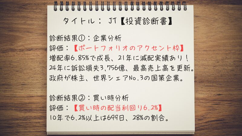 JTは、「ポートフォリオのアクセント枠」の一つと考えています。ポートフォリオのメインには添えず、ポートフォリオ全体の数%(配当金)になるように保有します。メインに添えるのは、安定かつ成長する優良企業です。
