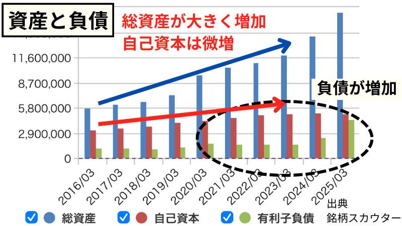 - 負債額の増加:積極的な事業投資を行う一方、負債額が増加している。