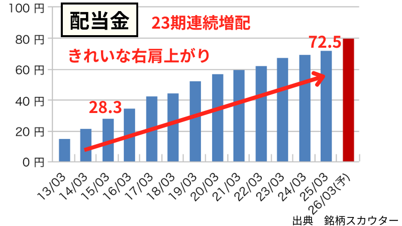 - 安定した増配実績:23期連続増配、10年で2.6倍に増配。