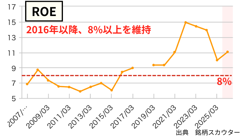 | ROE (収益性) | 12%以上 | 10%以上 | 8%以下 |