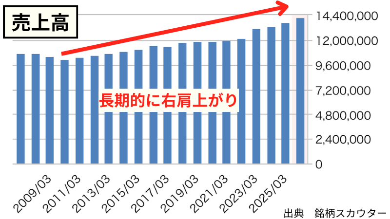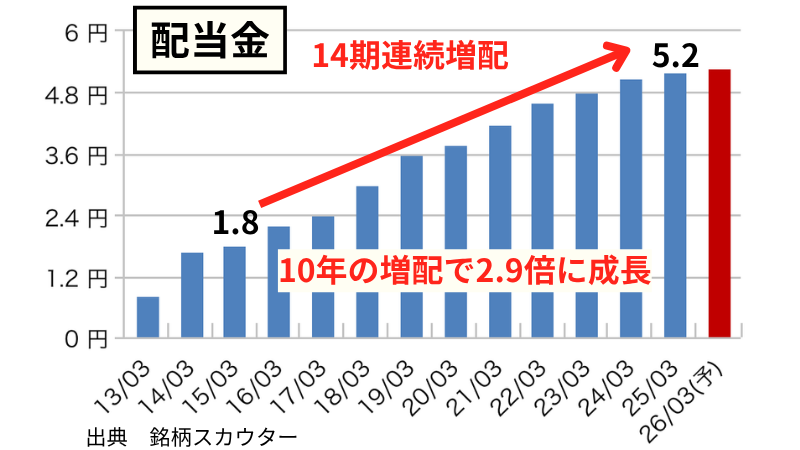 - 連続成長:14期連続増配の実績と、継続的な増配を掲げる配当方針