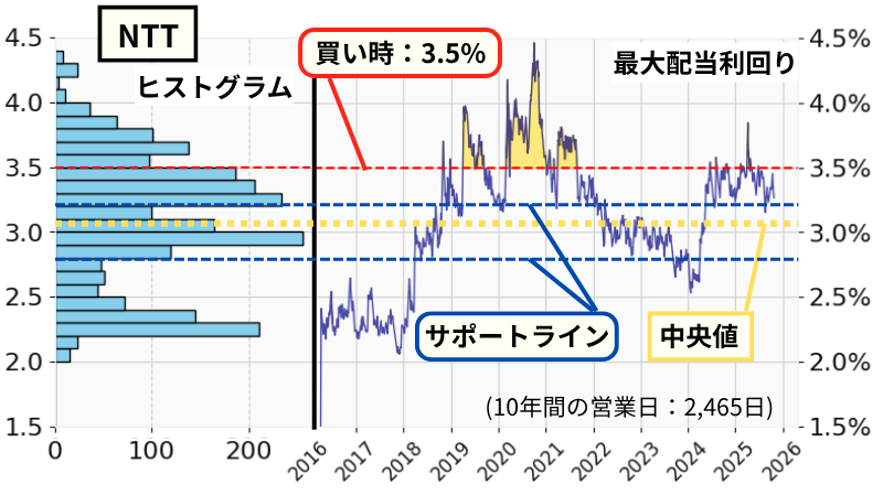 10年間で、取引可能な営業日は2,465日ありました。配当利回りの中央値は3.08%です。配当利回りの反発ポイントおよびヒストグラムの裾から、サポートラインを設定します。