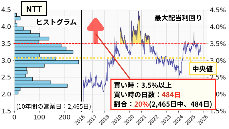 「買い時の利回りで購入できる日は、10年間で何日あったか?」を統計的に評価し、高値掴みをしない「買い時」を決めます。