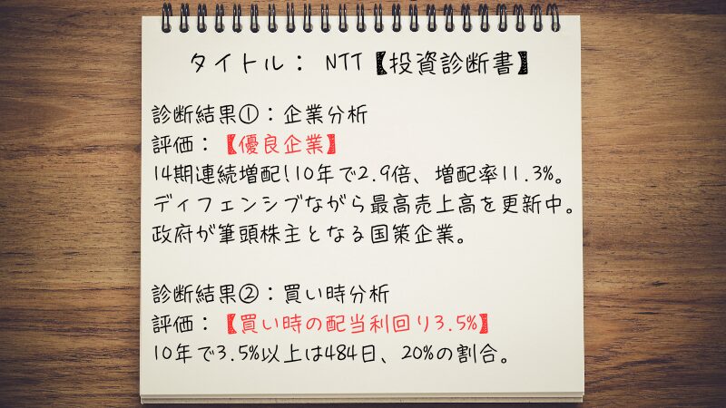 分析の結果、NTTは「優良企業」です。成長性・収益性・安定性がバランス良く揃っており、長期的な配当金と株価の成長が期待できる投資先候補です。