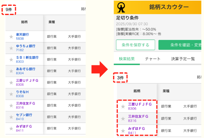 最初に5つの足切り条件で、「配当金と株価が成長する優良企業の候補」を絞り込みます。銀行セクターの場合は、足切り条件から自己資本比率を除外します。