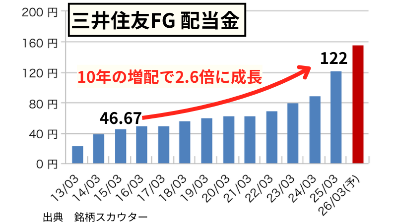 - 三井住友FG:非減配16年かつ累進配当。配当金の安定感最強。