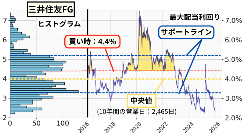 10年間で営業日は2,465日ありました。配当利回りの中央値は4.0%です。グラフから下記の特徴を探し、市場が意識しているサポートラインを設定します。