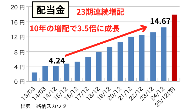 - 連続増配の実績:日本で7番目に長い23期連続増配。10年平均増配率は13.2%