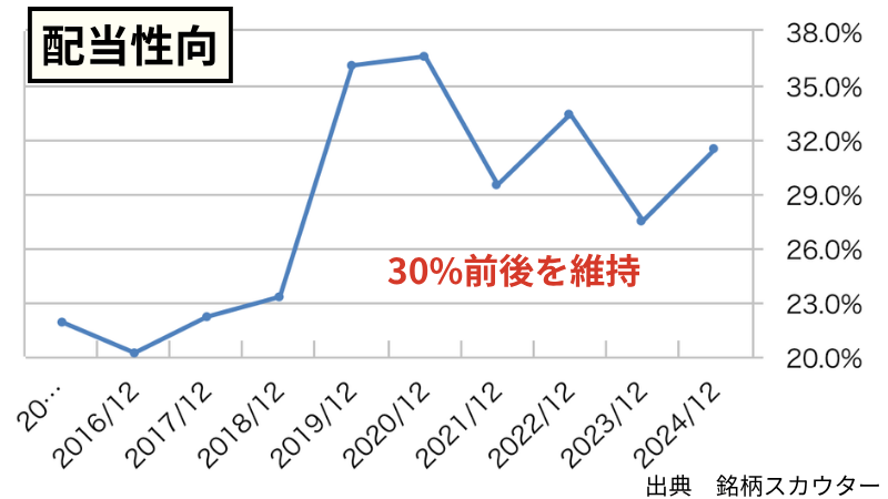2019年以降、配当方針により配当性向30%前後にいます。2025年度から35%へ引き上げられるため、より配当金の成長が期待できます。