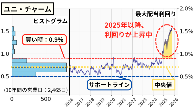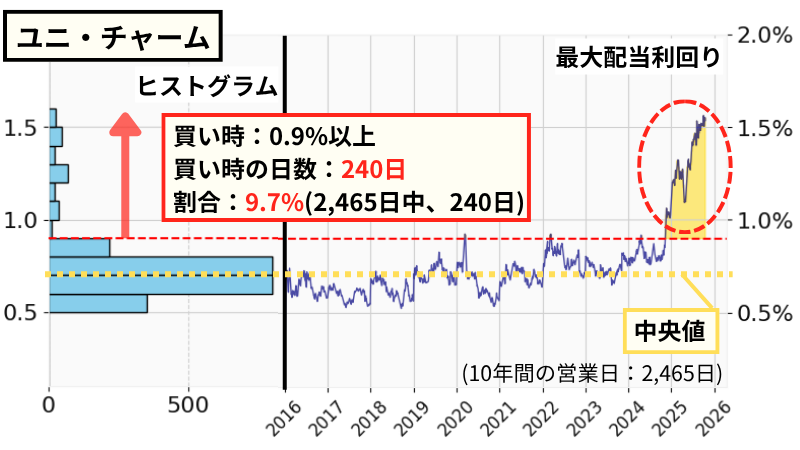 2016年から2024年まで0.5%〜0.9%の間を推移し、2025年以降0.9%以上に急上昇しています。狭いレンジに長期間いたため、配当利回りの反発ポイントとヒストグラムが集中しています。そのため、0.9%を買い時として分析を行います。
