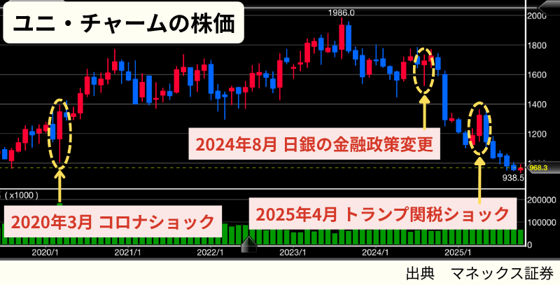 コロナショック、日銀ショックの際は配当利回り0.9%まで株価が下落。2024年11月から株価が減少傾向にあります。そのため、配当利回りが上昇し、トランプ関税ショックの最大利回りは1.3%となりました。